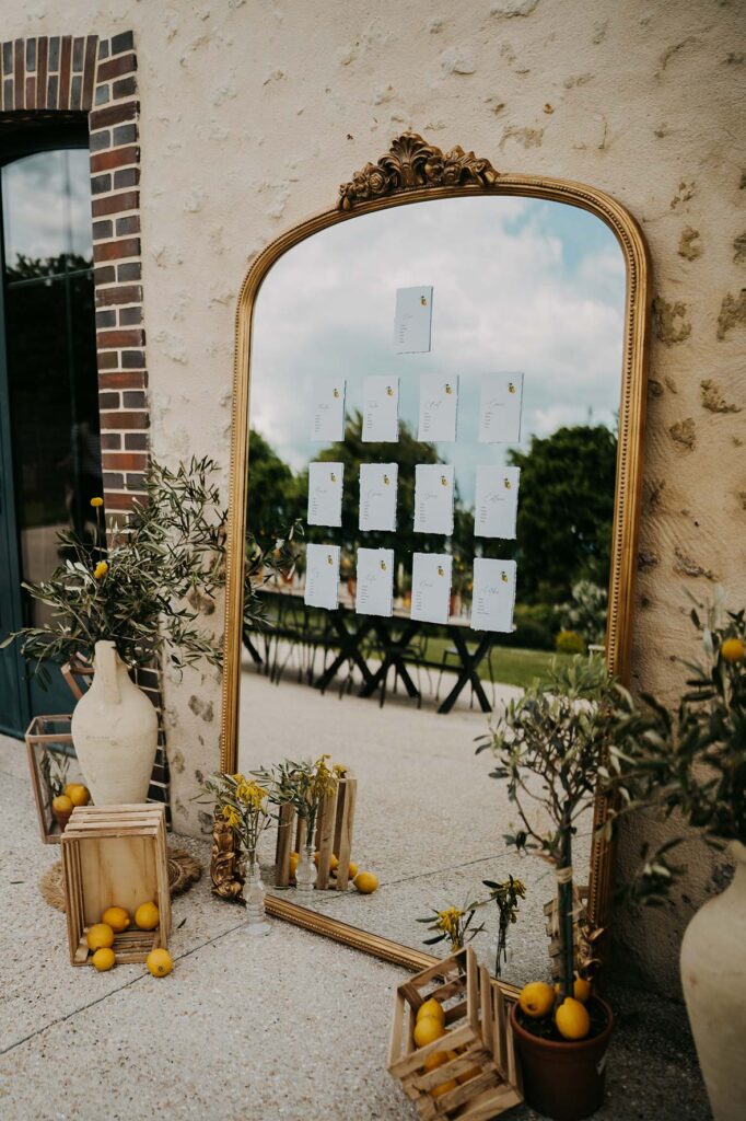 Empruntez, louez ou chinez un joli miroir ancien sur lequel vous écrirez manuellement votre plan de table au feutre blanc lavable (type Posca) ou sur lequel vous viendrez coller à la pâte à fin des cartes plan de table.