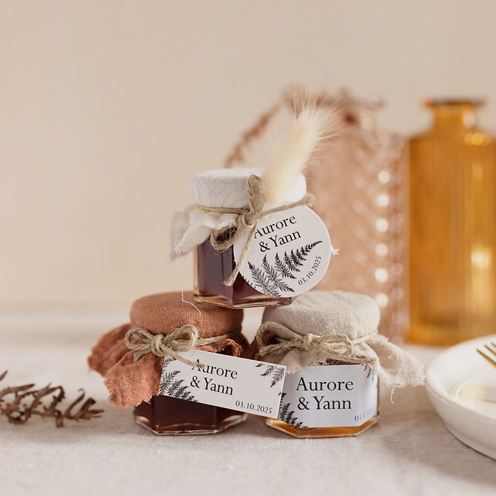Vous n’avez pas le courage de vous lancer dans un DIY ? Merci Coco propose des minis pots de confiture aux jolies étiquettes personnalisables à assortir à votre décoration de mariage.