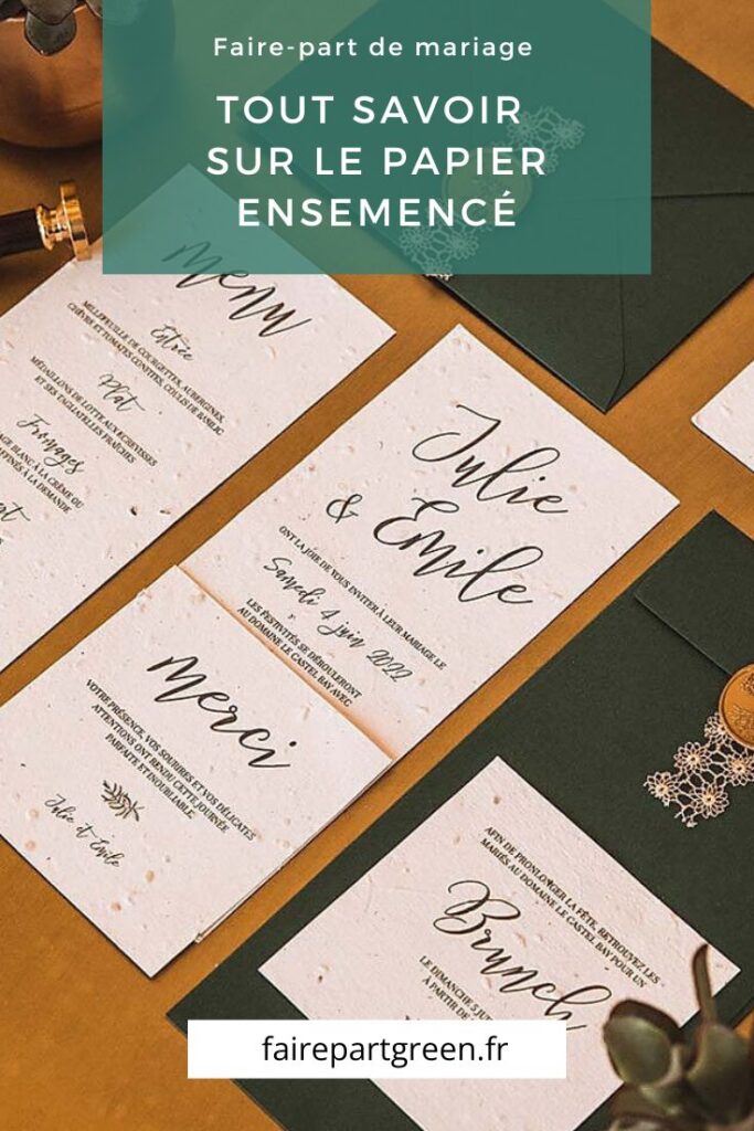 Personnellement je privilégie l’utilisation d’un papier ensemencé fabriqué en France avec des fibres recyclées car son impact sur l’environnement est moins important. Vous trouverez plus d’informations à ce sujet dans l’article Pourquoi choisir un papier recyclé pour vos faire-part de mariage.