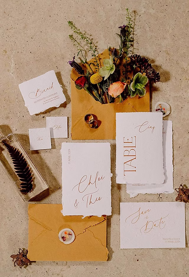Fabriqué à la main au tamis, le papier artisanal à bords frangés peut-être fabriqué à partir de fibres de papier 100% recyclées. Le papier que j’utilise pour mes faire-part de mariage en papier artisanal est fabriqué en Ardèche à partir de fibres de papier 100% recyclé en circuit court. Il s’agit de chutes de papier d’un atelier d’impression voisin. Le papier ne subit aucun traitement chimique, il se compose uniquement de chutes de papier et d’eau. Chaque feuille est formée à partir de cette pâte à papier au tamis, ce qui lui donne ses jolis bords frangés à l’aspect irrégulier, pour un rendu authentique et raffiné.