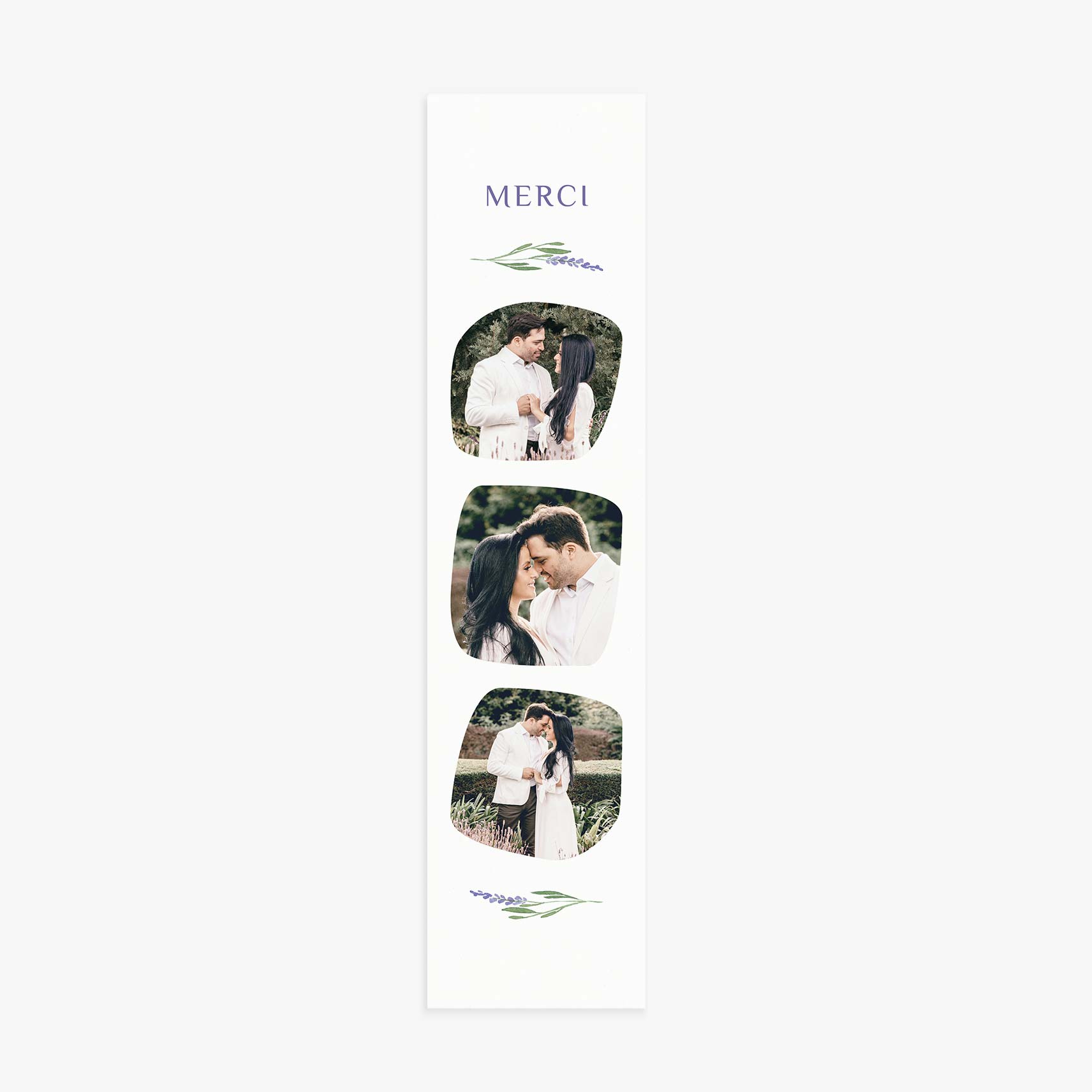 Il y avait de la lavande dans votre décoration de mariage ? Choisissez une carte de remerciement format marque page avec vos trois plus belles photos de mariage et des brins de lavande peints à l’aquarelle !