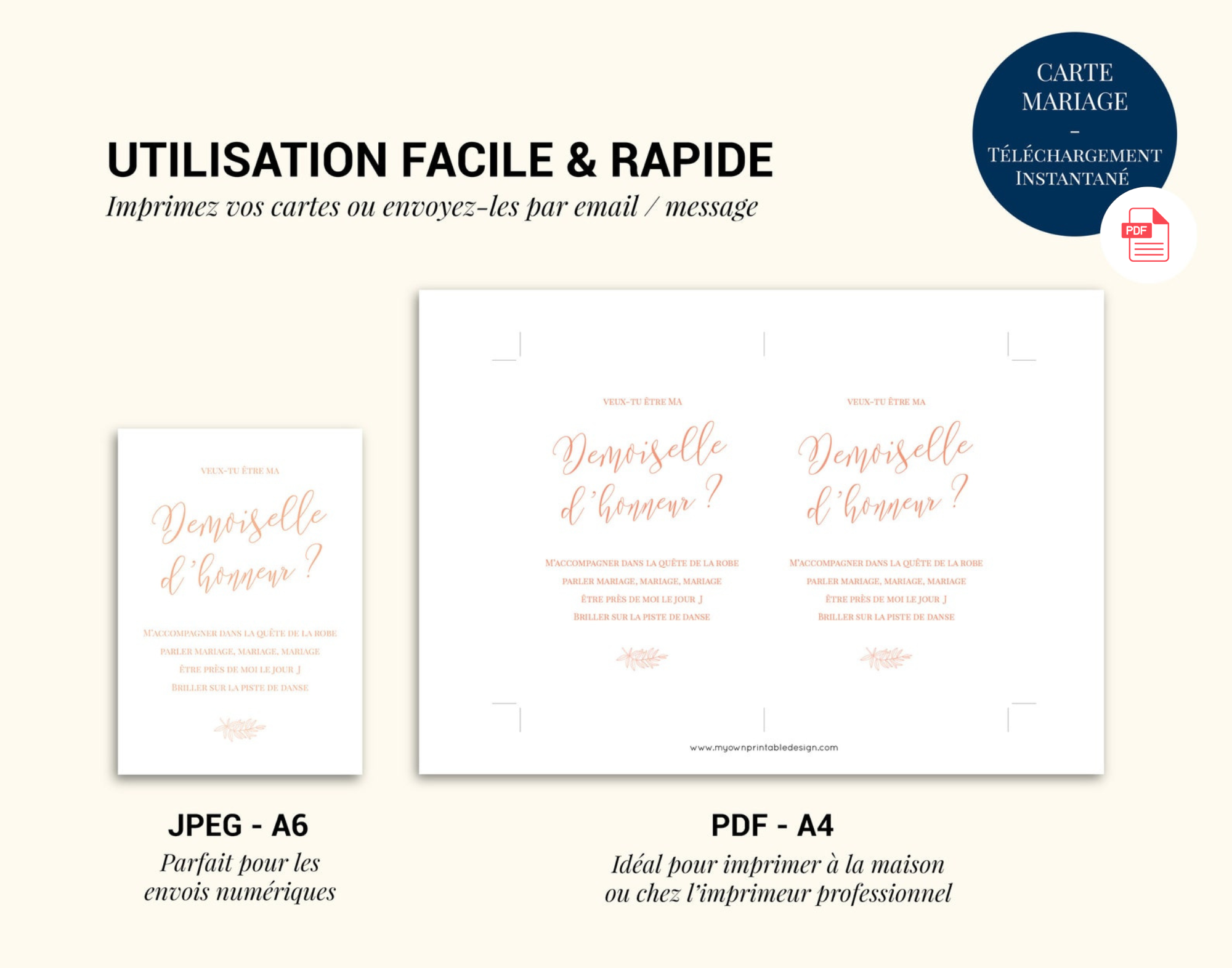 Cette Carte demande demoiselle d’honneur à imprimer est idéale pour une future mariée souhaitant faire une demande originale, élégante et rapide à organiser.