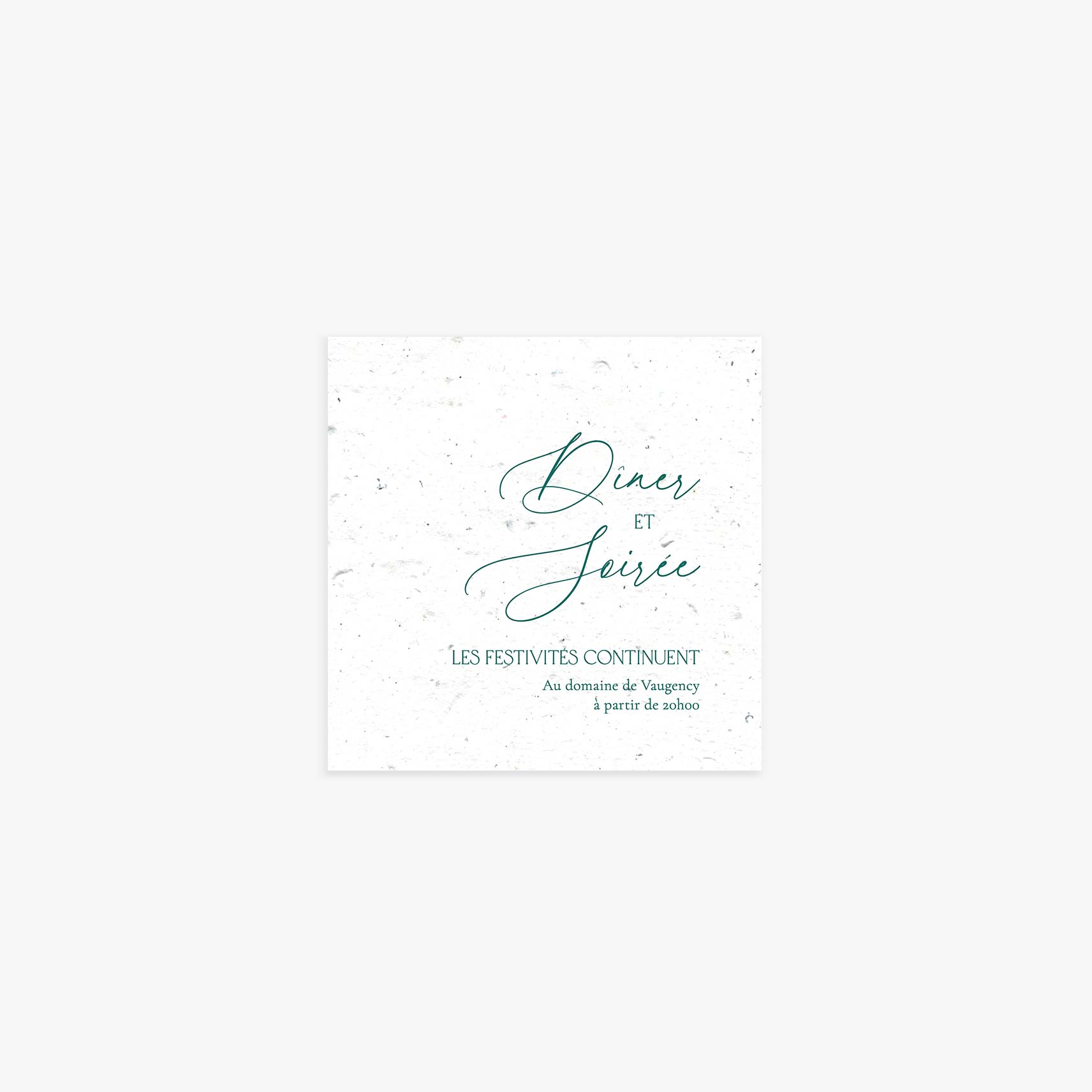 Tous vos convives ne sont pas invités au dîner et/ou au brunch après le vin d’honneur ? Ce coupon à planter accompagnera vos faire-part. Sur vos faire-part mentionnez seulement la cérémonie et le cocktail. Ajoutez ensuite une petite carte « dîner » et/ou « brunch » pour les personnes que vous souhaitez convier à la totalité des festivités.