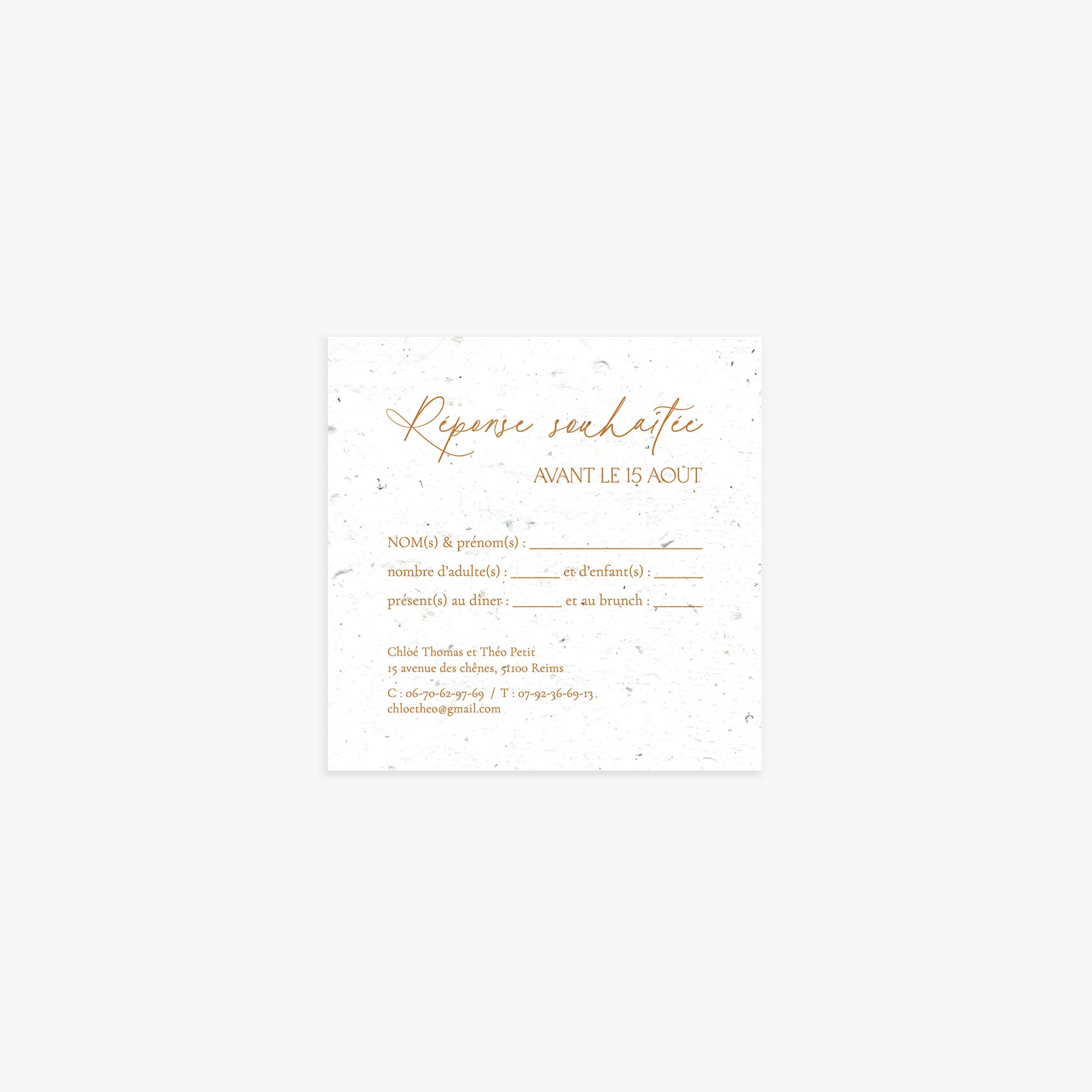 – carton réponse : aussi appelé coupon RSVP, il a pour but de collecter les réponses des invités (ainsi que des informations sur leurs éventuelles allergies & régimes alimentaires).