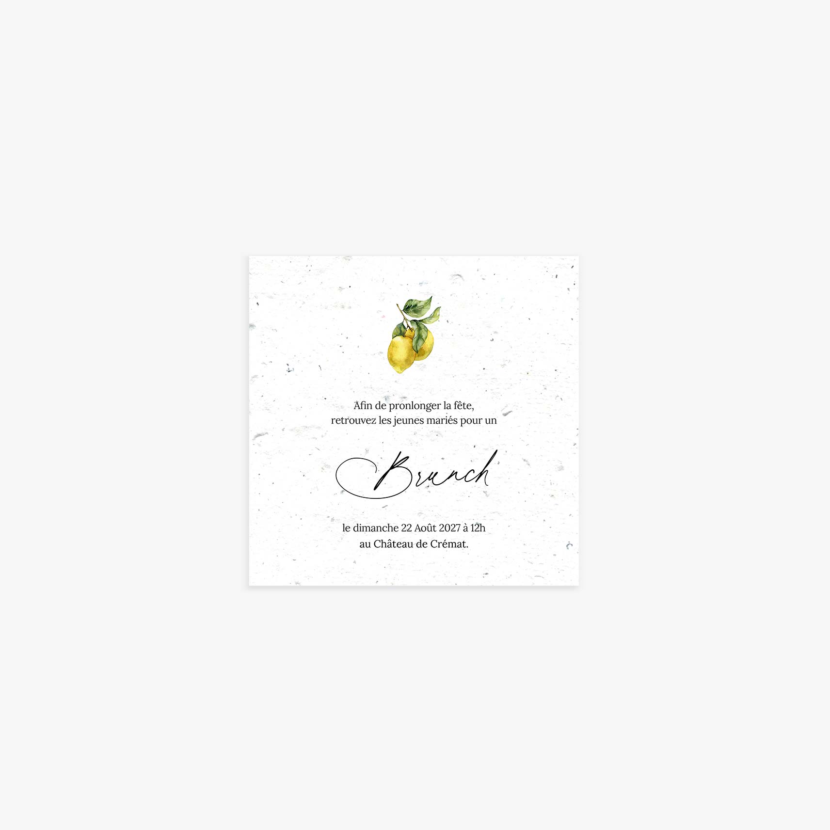 Tous vos convives ne sont pas invités au dîner et/ou au brunch après le vin d’honneur ? Ce coupon à planter accompagnera vos faire-part sur le thème du citron. Sur vos faire-part mentionnez seulement la cérémonie et le cocktail. Ajoutez ensuite une petite carte « dîner » et/ou « brunch » pour les personnes que vous souhaitez convier à la totalité des festivités.