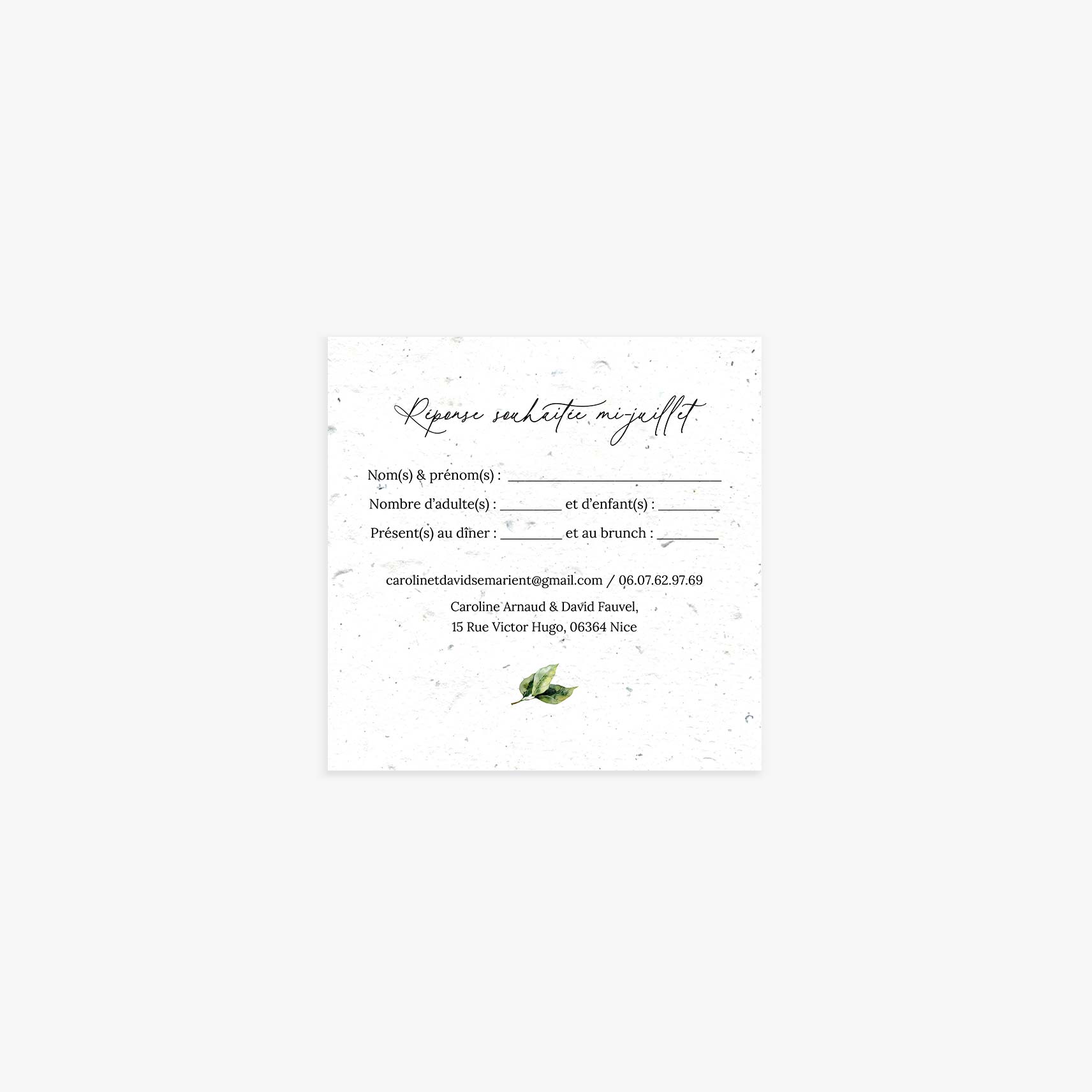 – carton réponse : aussi appelé coupon RSVP, il a pour but de collecter les réponses des invités (ainsi que des informations sur leurs éventuelles allergies & régimes alimentaires).