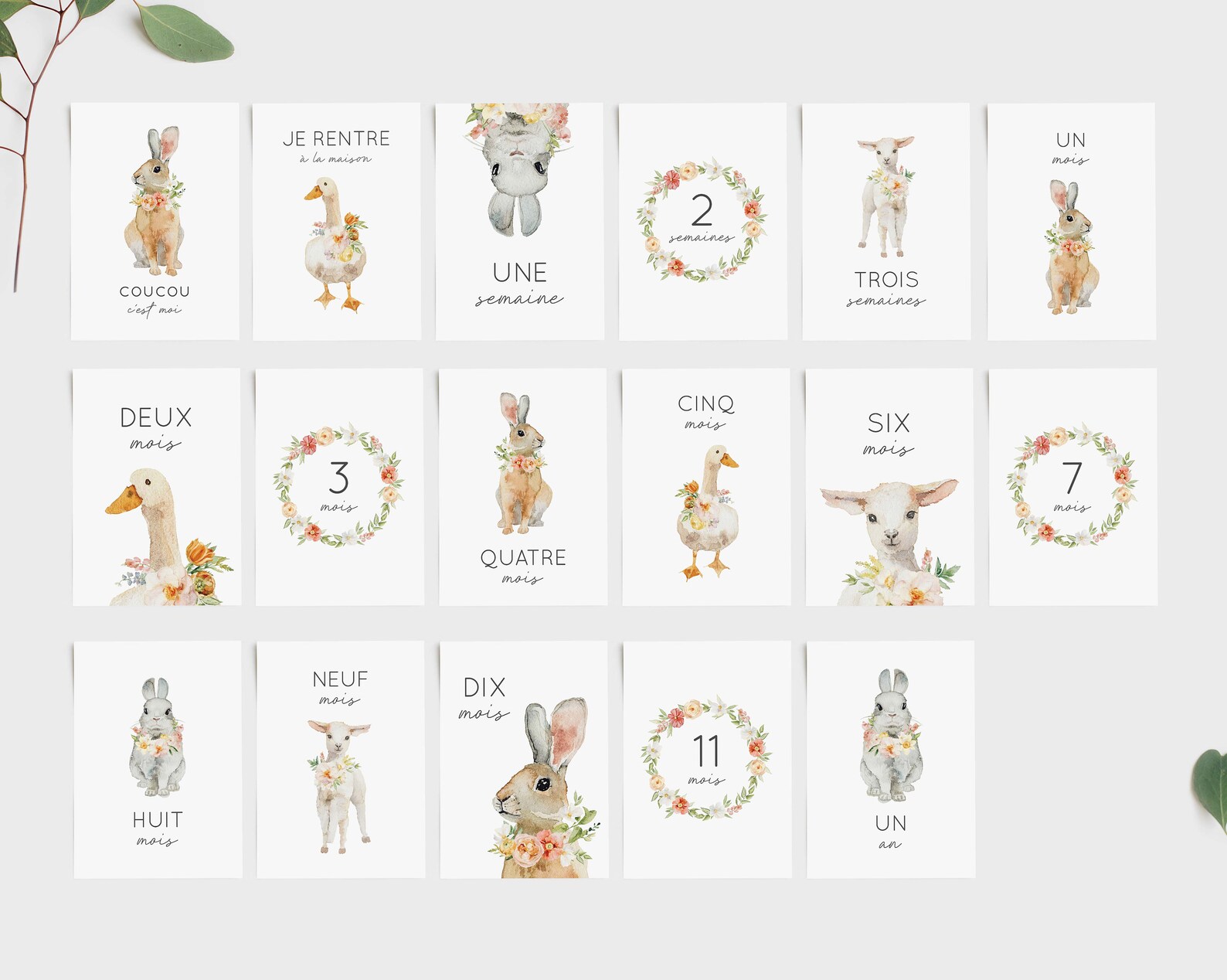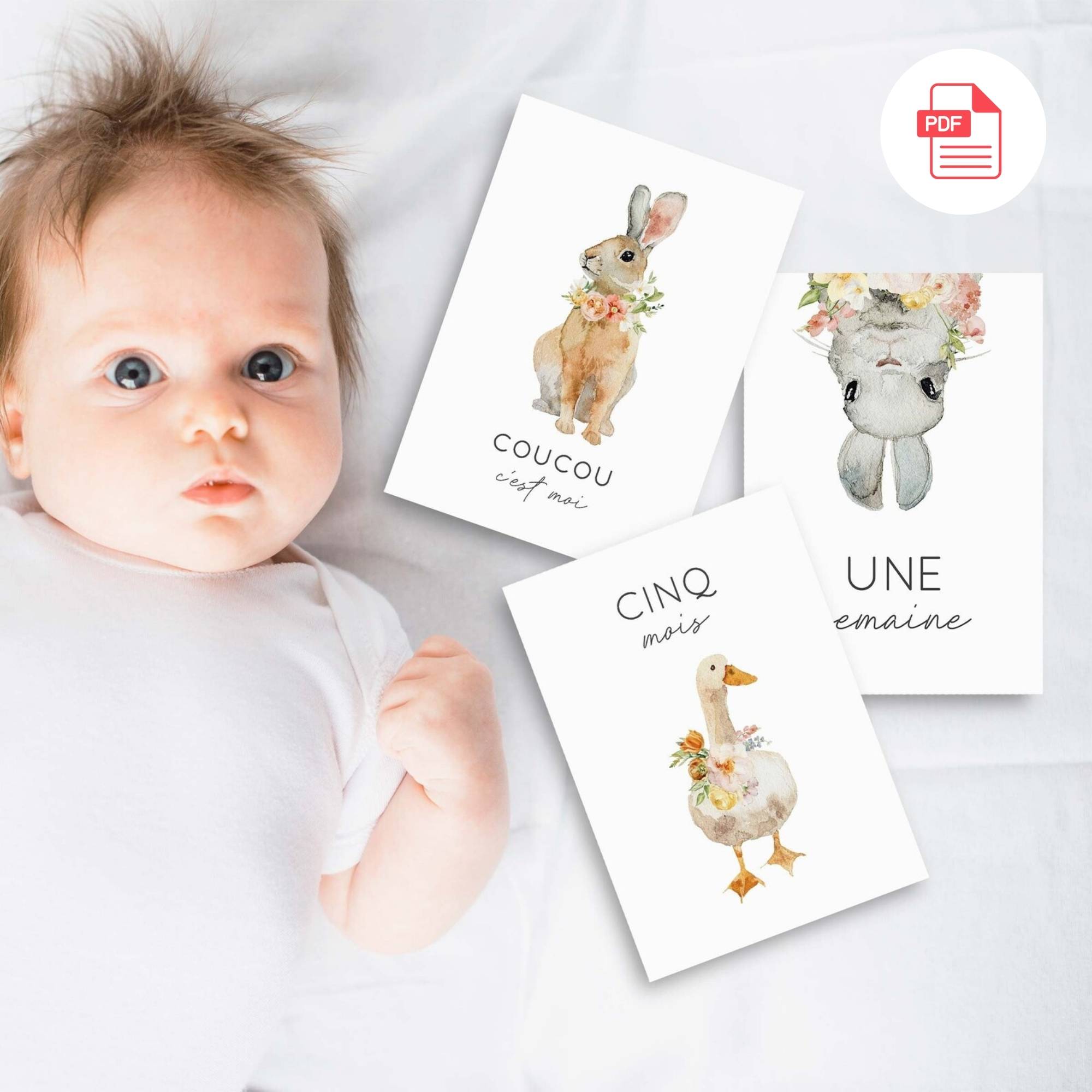 Accueil > Naissance > Cartes à imprimer (PDF) téléchargement instantané > Cartes étapes bébé 1ère année animaux fleuris – fichiers PDF à imprimer