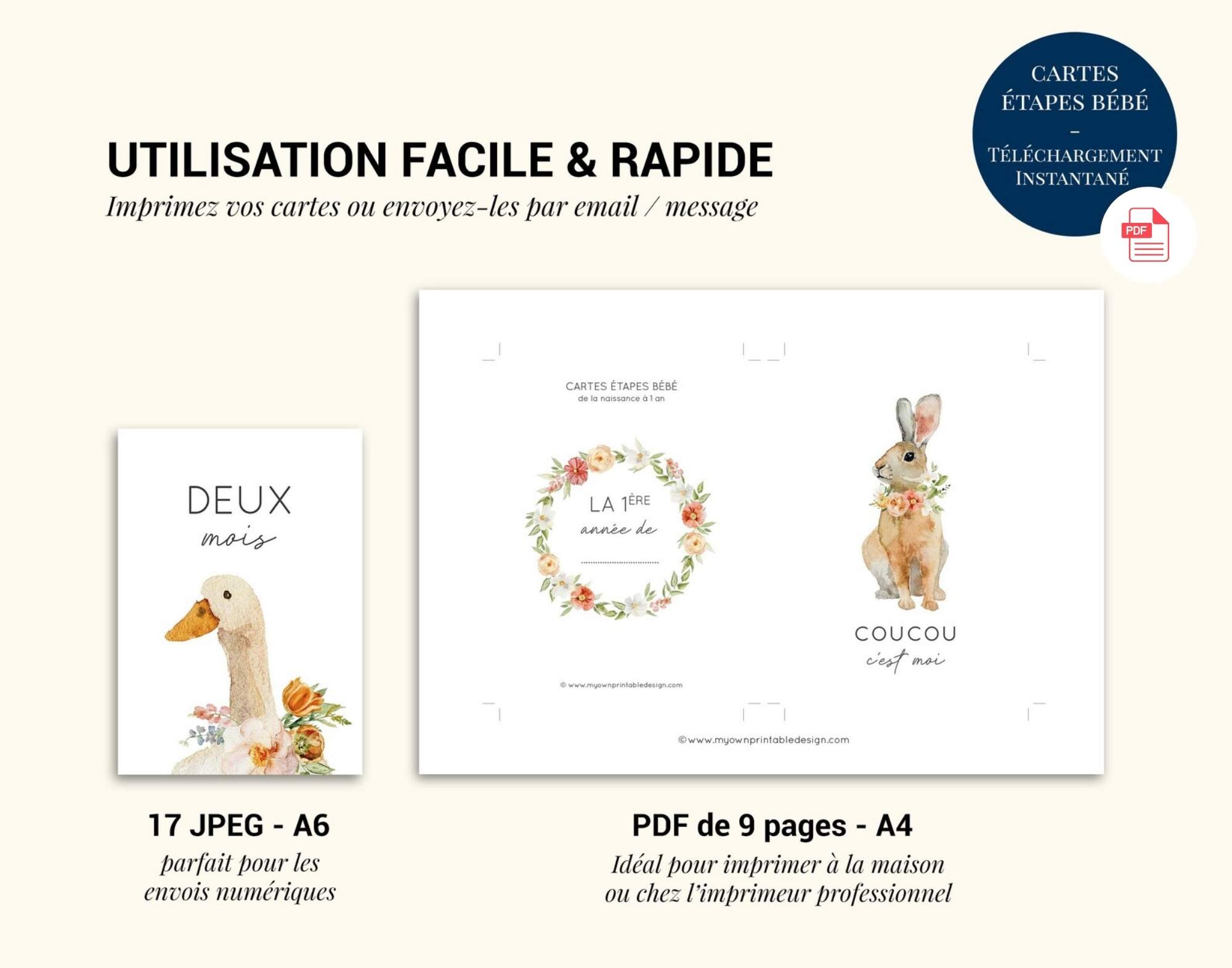 Ces PDF de cartes étapes bébé à imprimer sont fournis sous forme de fichiers numériques haute qualité, disponibles immédiatement après l’achat (lien de téléchargement envoyé par email).