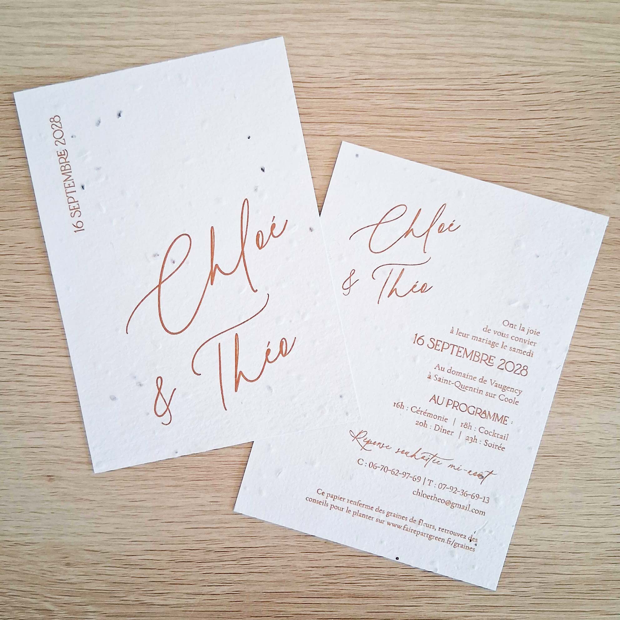 N’hésitez pas à demander des changements de couleurs pour que votre faire-part de mariage ensemencé s’accorde parfaitement à votre décoration de mariage, cette personnalisation est incluse !
