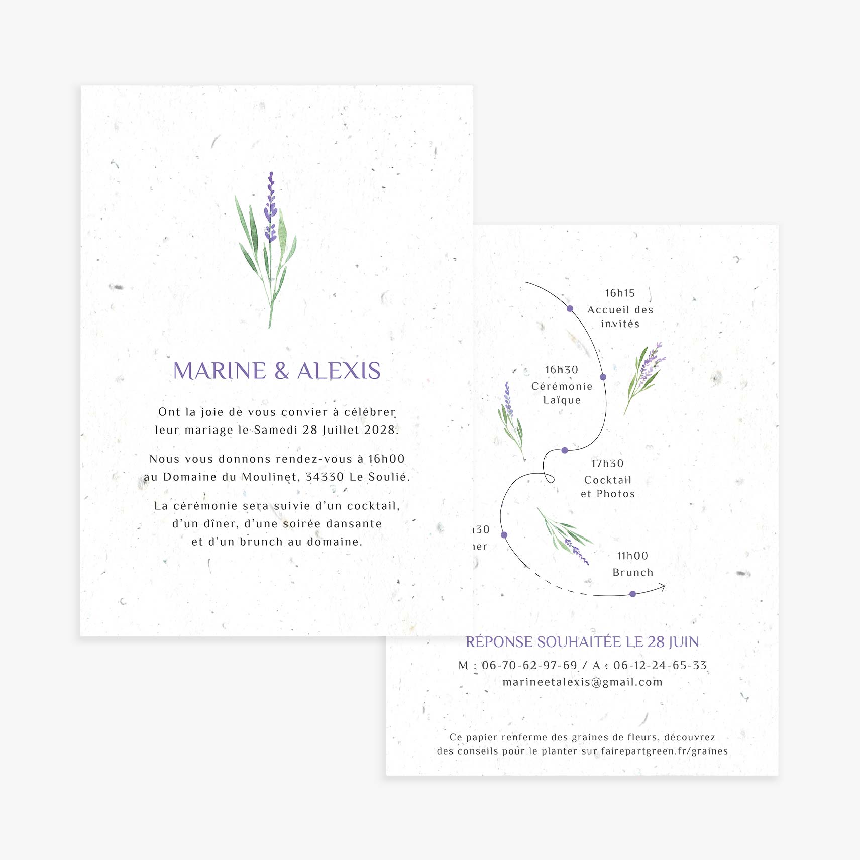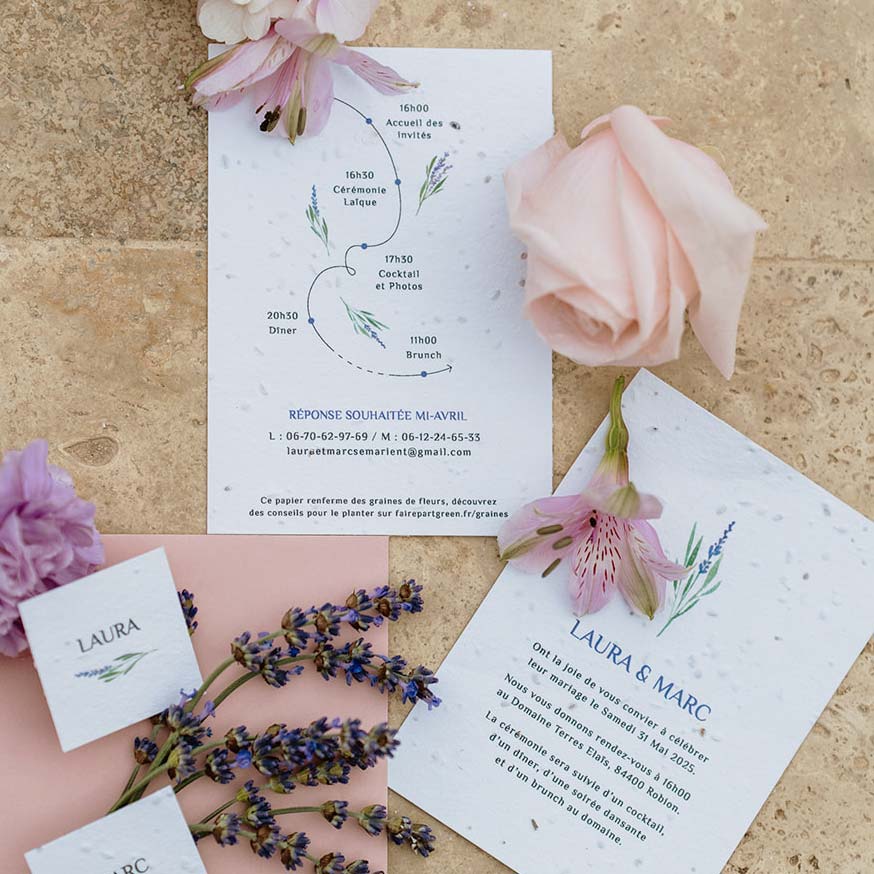 Un faire-part de mariage délicat et poétique. Illustré de brins de lavande, ce faire-part de mariage ensemencé au design moderne est idéal pour convier vos invités à votre mariage. Son papier artisanal renferme des mélanges de graines de fleurs ou d’aromates, vos invités pourront le planter après la fête et faire fleurir leurs jardins !