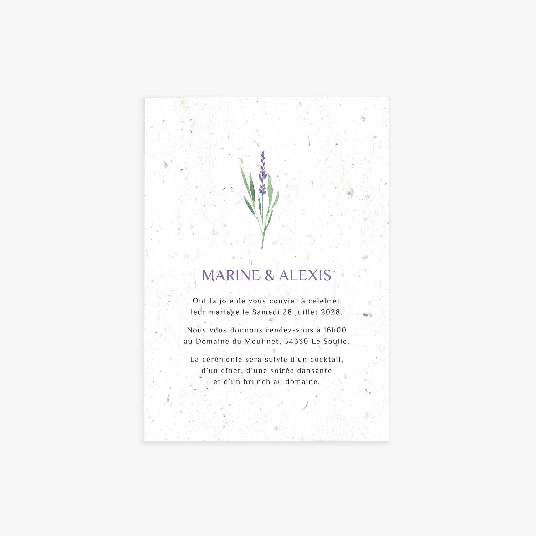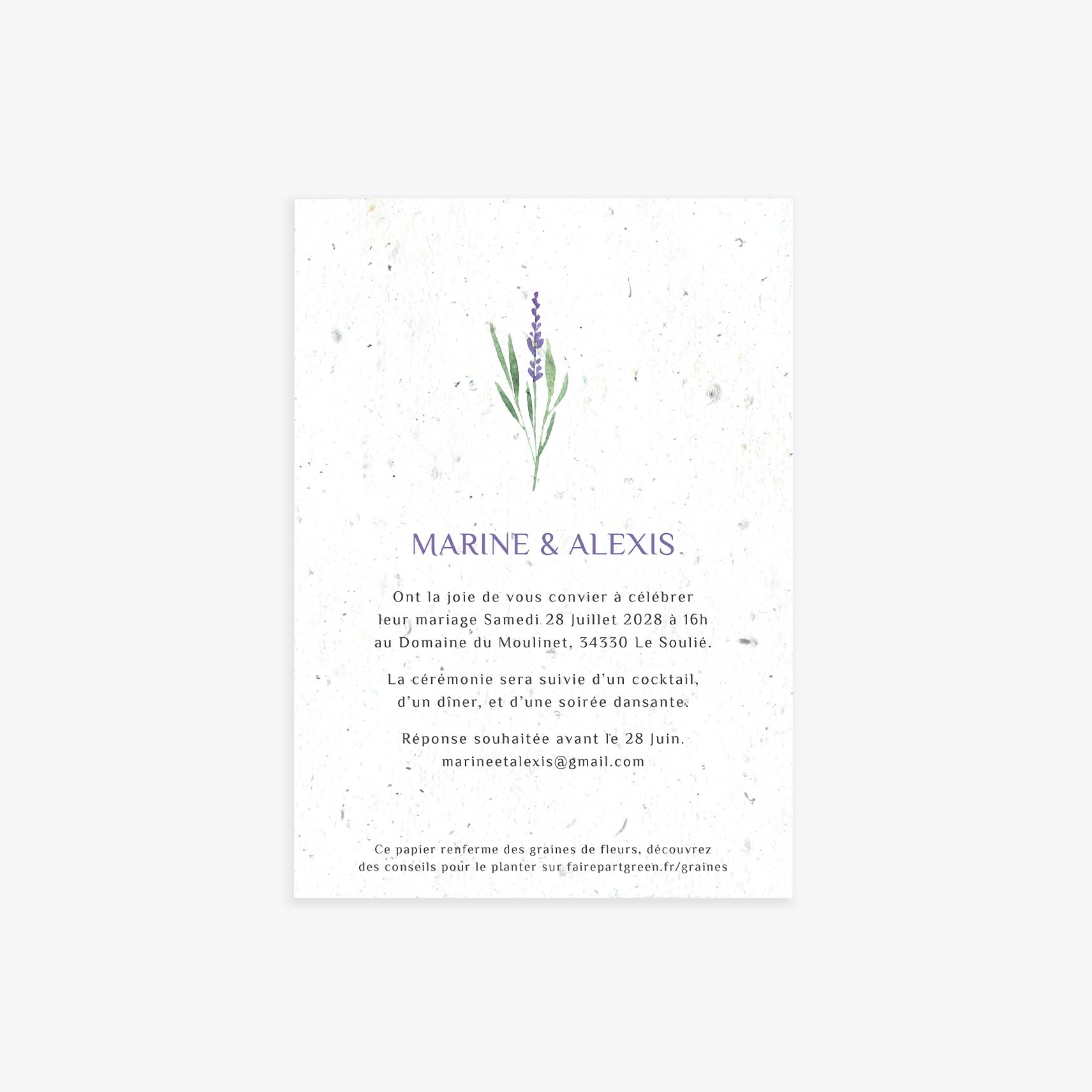 Il y aura de la lavande dans votre décoration de mariage ? Annoncez l’ambiance dès l’envoi des invitation grâce au faire-part de mariage à planter Lavande !