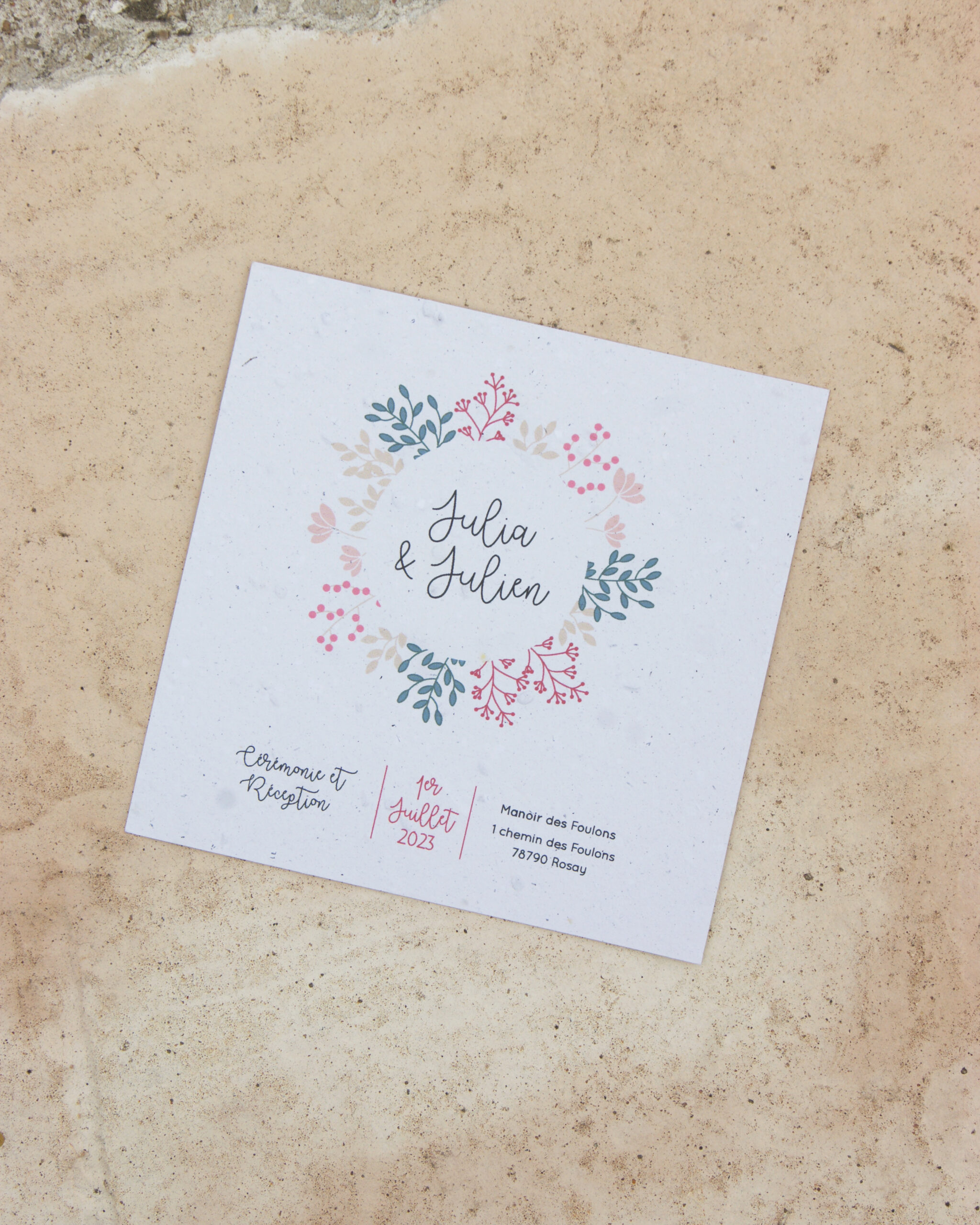 N’hésitez pas à demander des changements de couleurs pour que votre faire-part de mariage ensemencé s’accorde parfaitement à votre décoration de mariage, cette personnalisation est incluse !
