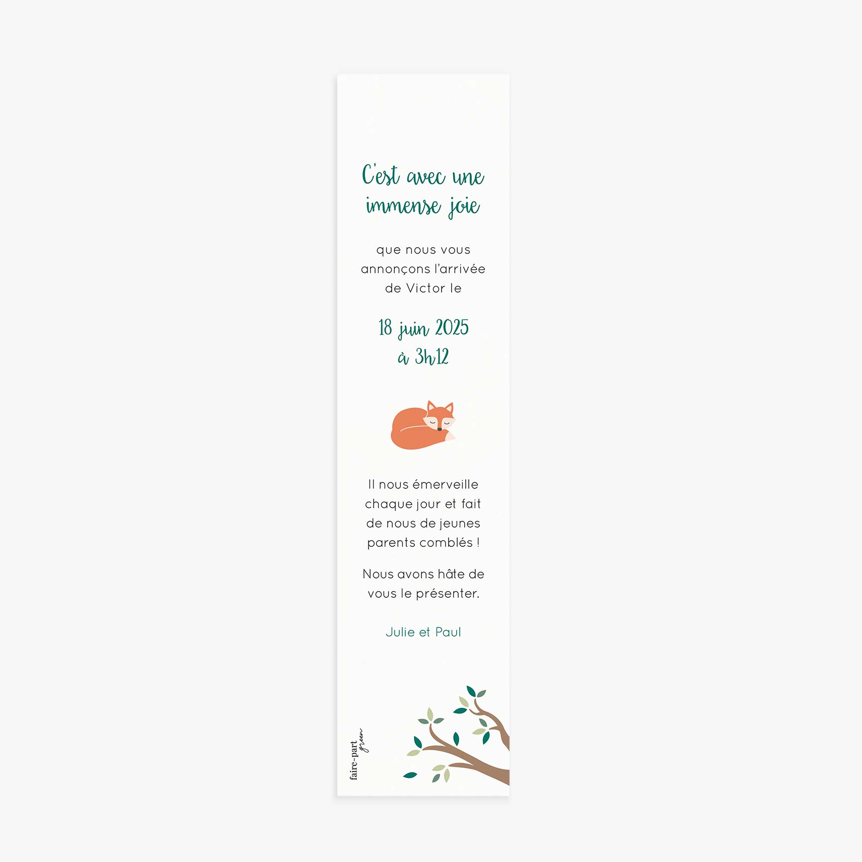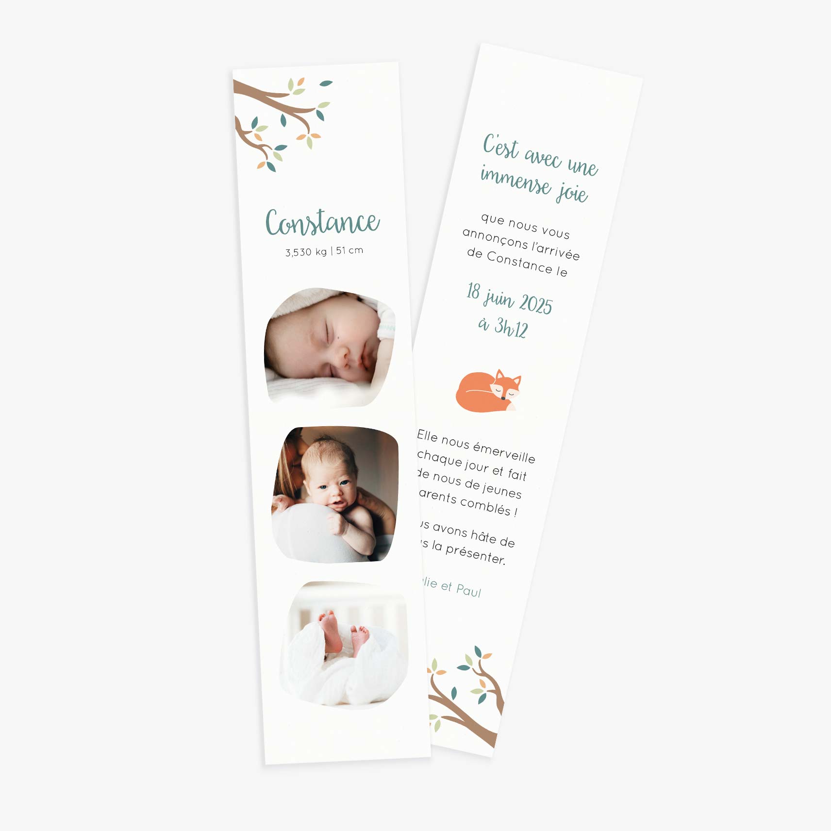 Un faire-part de naissance marque page illustré d’un arbre et d’un petit renard. Annoncez l’arrivée de bébé avec un faire-part de naissance qui met la nature à l’honneur et célèbre la vie sous toutes ses formes. Le faire-part Arbre de vie dévoilera l’arrivée de bébé tout en douceur.