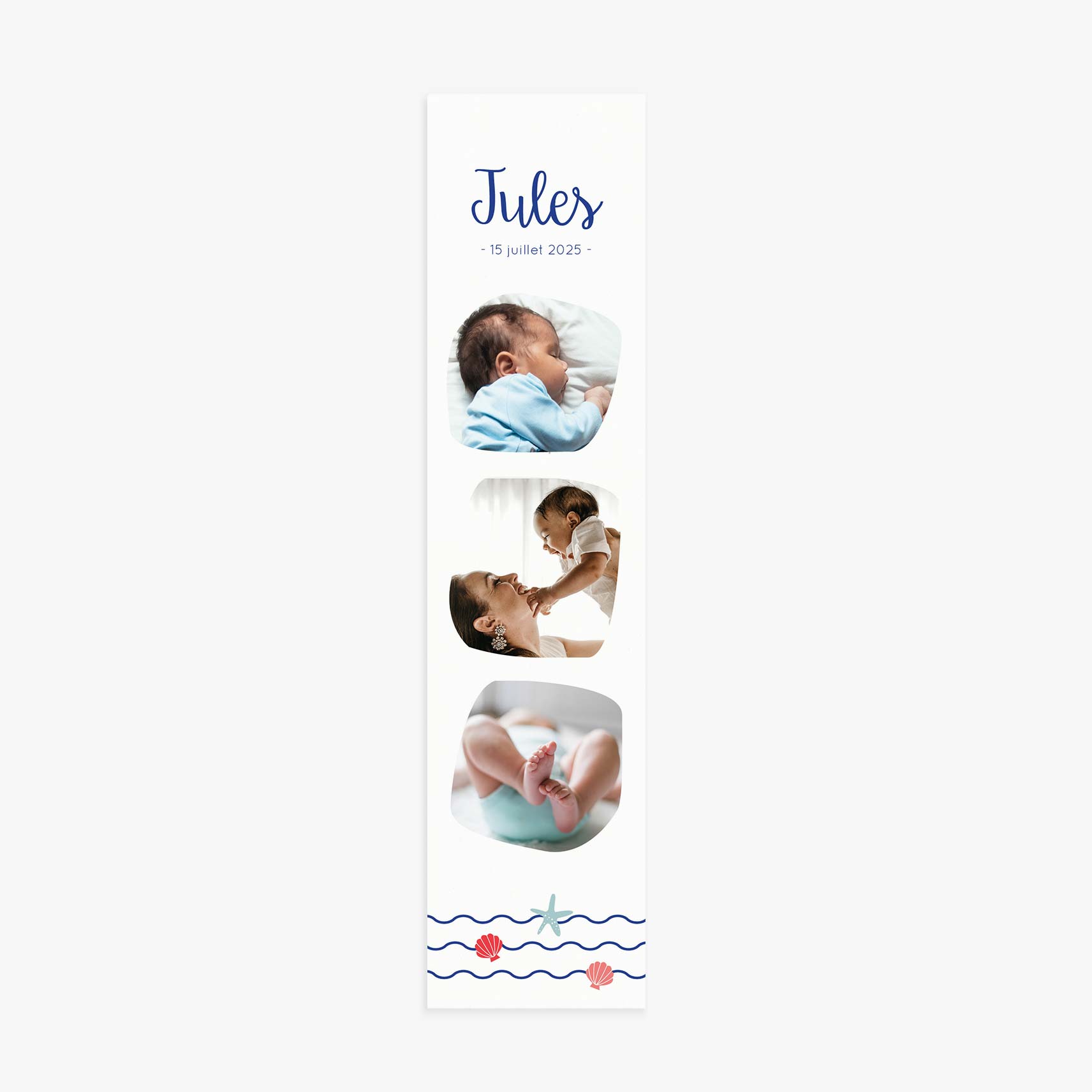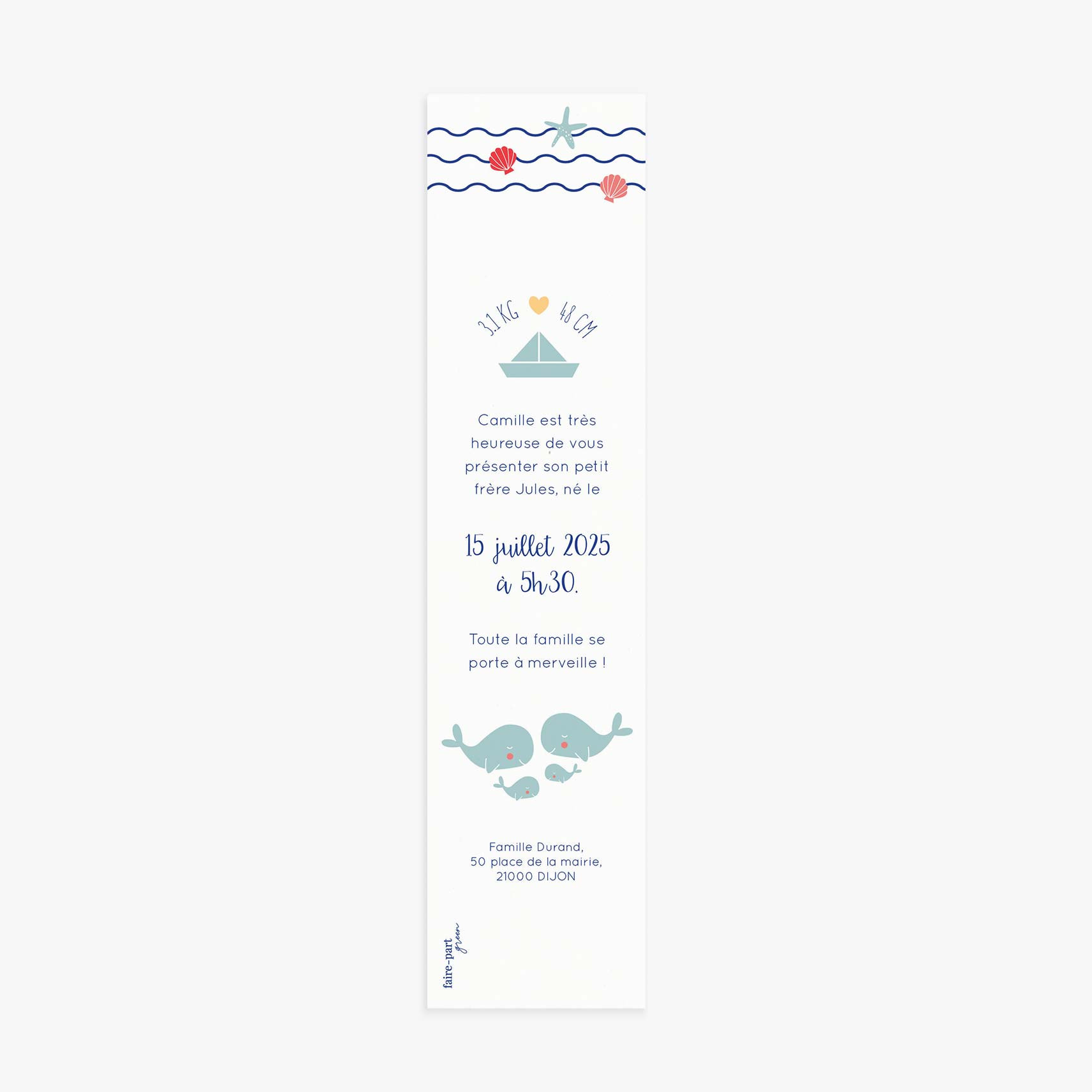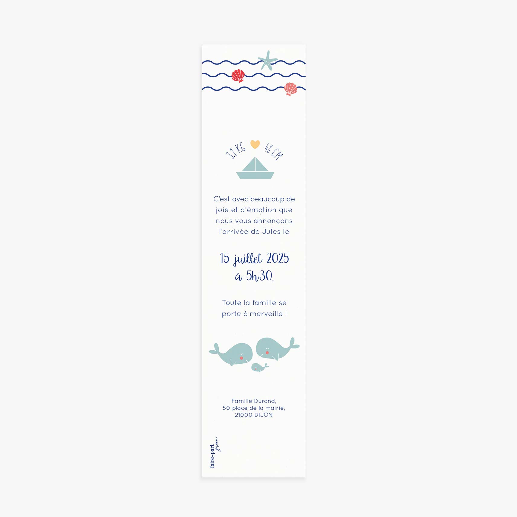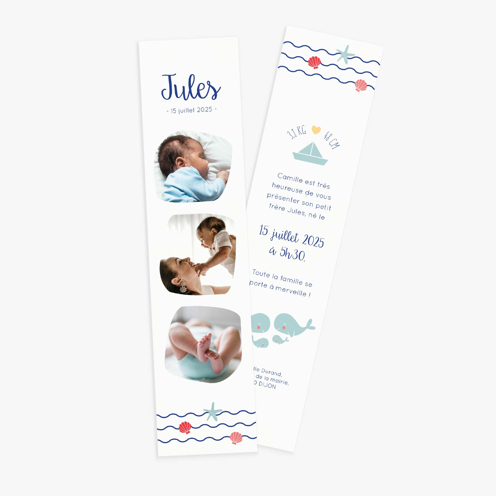 Un faire-part de naissance marque page illustré d’une jolie famille de baleine. Annoncez l’arrivée de bébé avec un faire-part de naissance marque page illustrant votre petite famille. Le faire-part Baleine dévoilera l’arrivée de bébé avec beaucoup de tendresse. Les jolies photographies de votre bébé et les petites illustrations marines en feront fondre plus d’un !