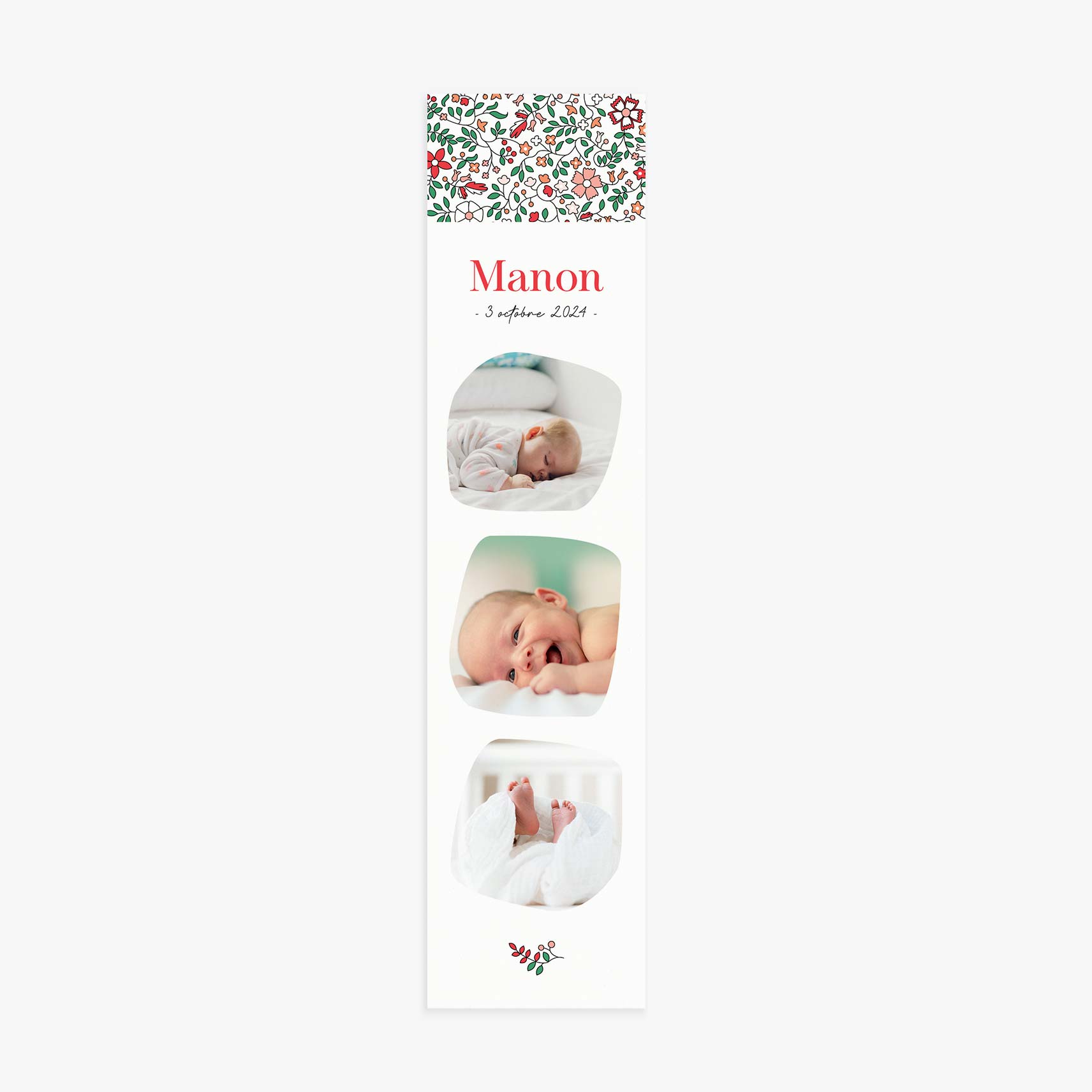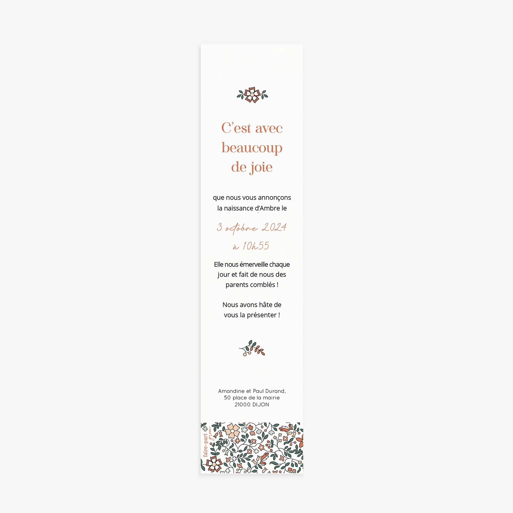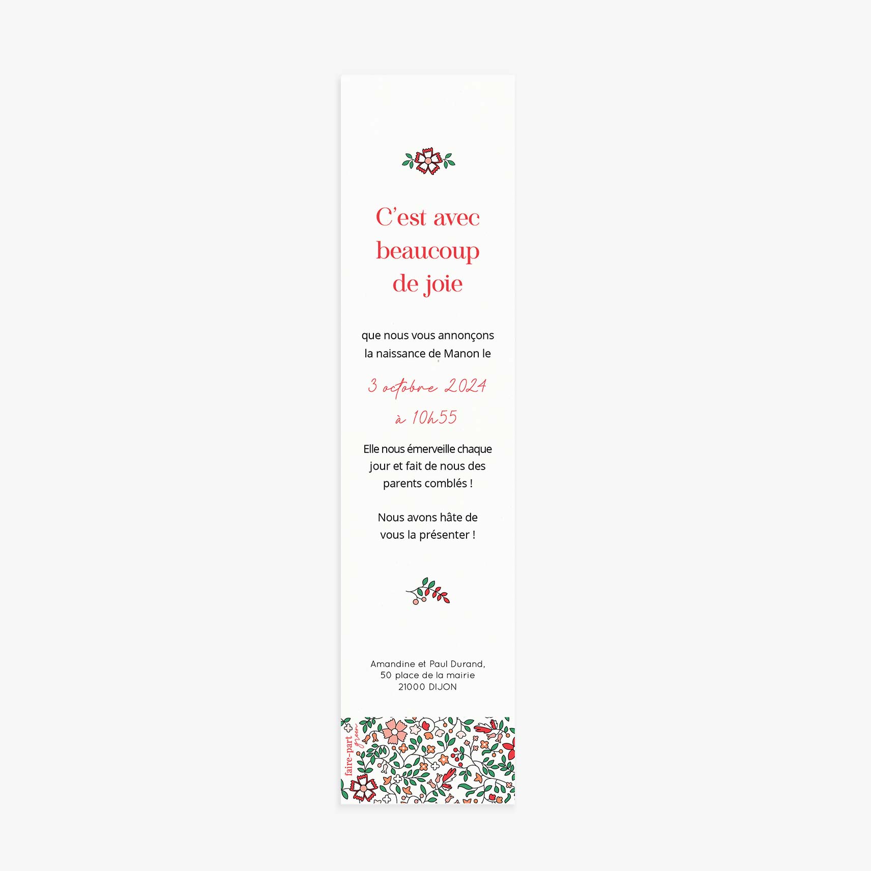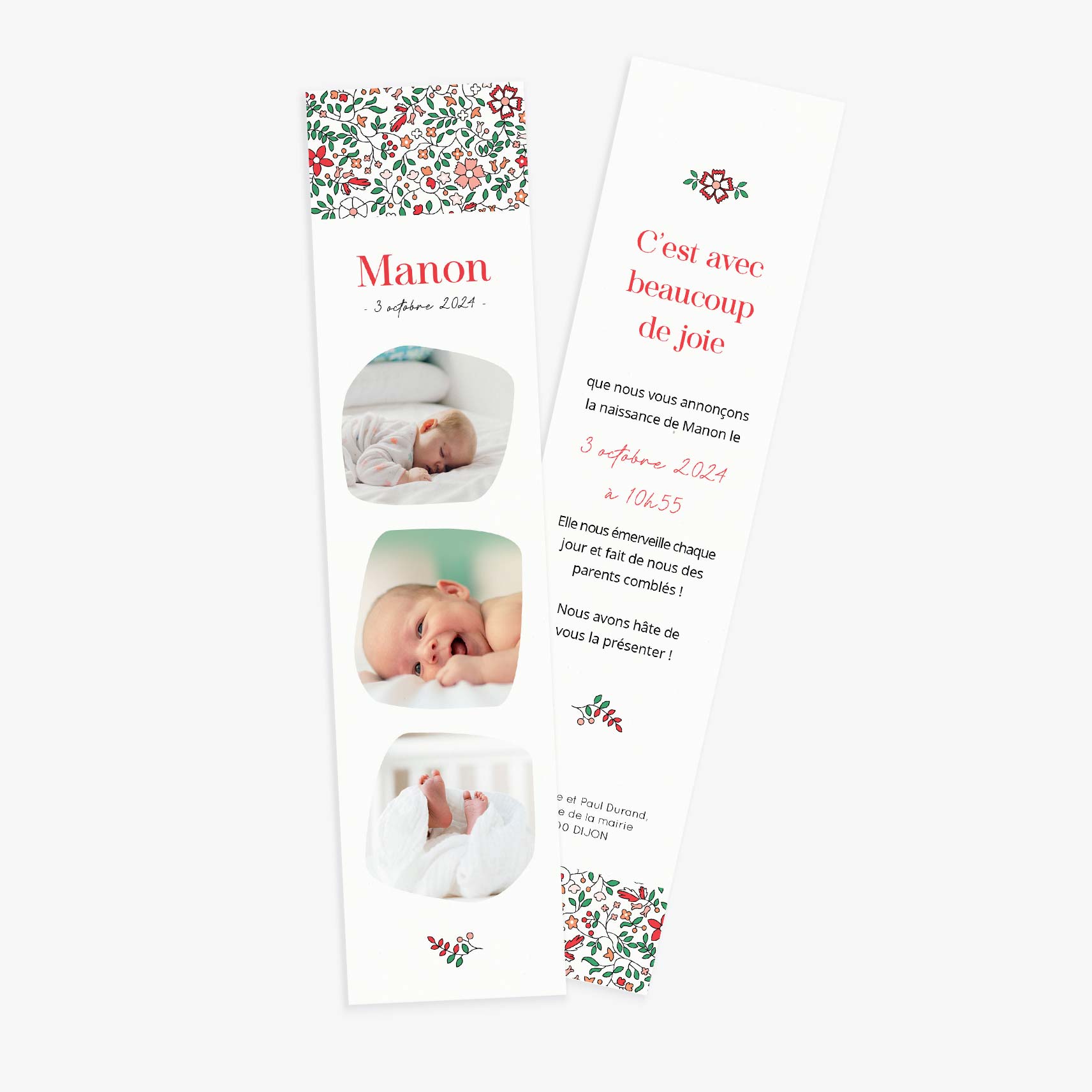 Un faire-part de naissance marque page inspiré des motifs liberty. Illustré de feuillages et de fleurs, avec une typographie moderne, le faire-part de naissance Liberty annoncera l’arrivée de bébé tout en douceur. Les jolis motifs floraux et les trois photos de votre bébé en feront fondre plus d’un !