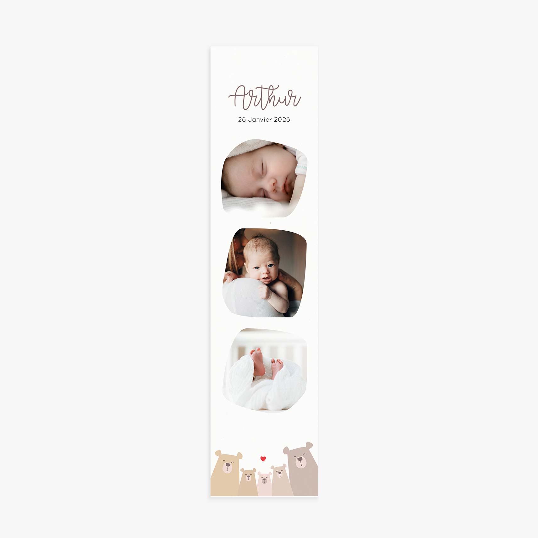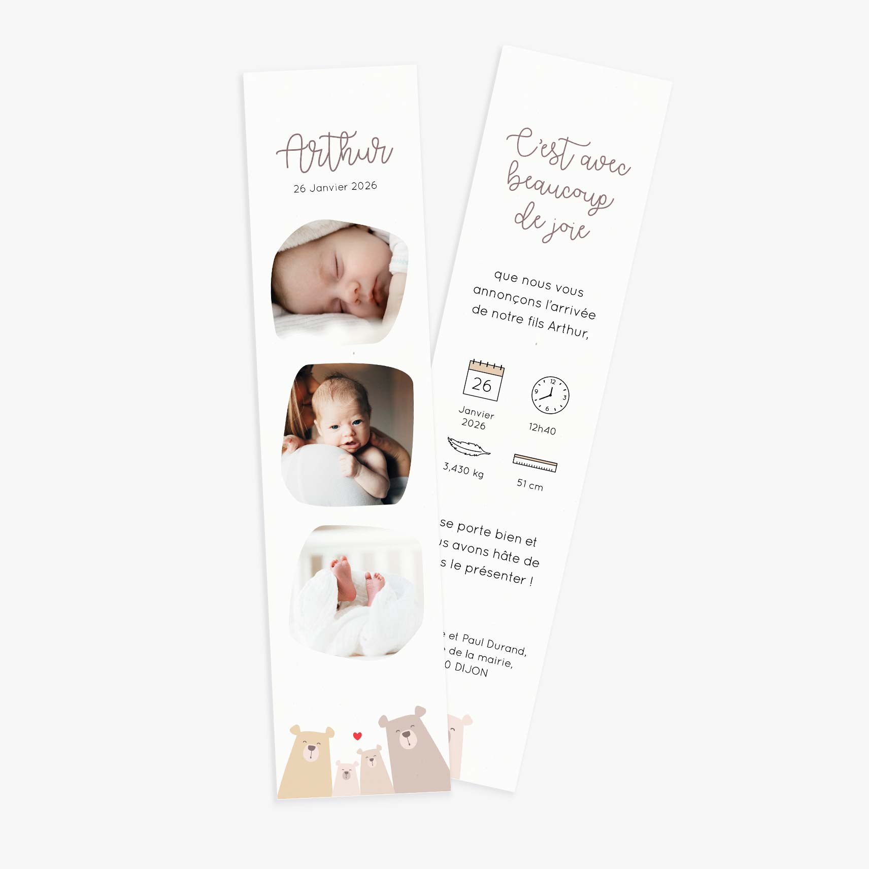 Un faire-part de naissance marque page illustré d’une charmante famille d’ours. Annoncez l’arrivée de bébé avec un faire-part de naissance illustrant votre petite famille. Le faire-part Petit ours dévoilera l’arrivée de bébé avec tendresse. Les trois photos de bébé et les petits ours en feront fondre plus d’un !