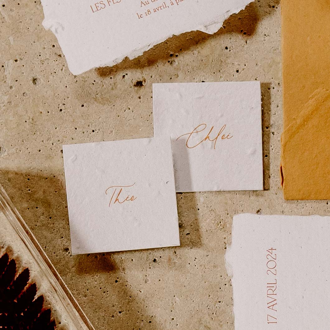 Des cartes à planter après la fête : le papier des marque-places est ensemencé, il renferme des petites graines de fleurs ou d’aromates. Vous pourrez donc les planter après votre évènement et faire pousser des fleurs ou des herbes aromatiques.
